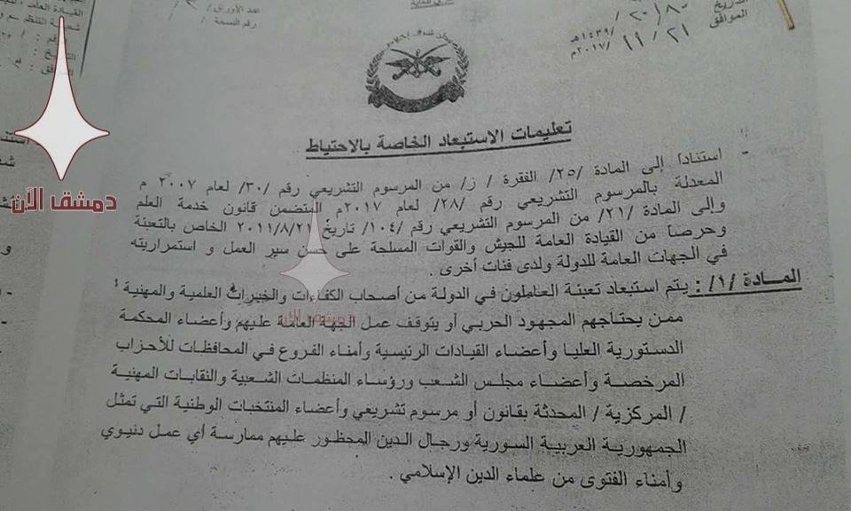 RojavaNews: أصدرت وزارة الدفاع التابعة للنظام السوري قراراً، ينص على رفع سقف سن المطلوبين للخدمة الاحتياطية والتي كانت ضمن فئة الذكور الذين تتراوح أعمارهم بين 25 – 42 عاماً.