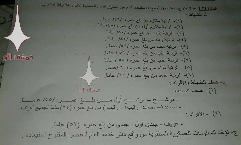 ووفق التعليمات الجديدة يرفع سن المكلف الاحتياطي إلى 52 عامًا، بدلًا من 42 للأفراد وصف الضباط، ويبقى استدعاء الاحتياط في سن 46 للضباط .