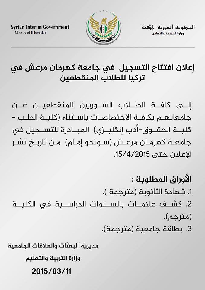 المبادرة للتسجيل في جامعة ( كهرمان) مرعش ويبدأ التسجيل من 11 / 3 / 2015 لغاية / 15 / 3 / 2015 /، والأوراق المطلوبة هي: