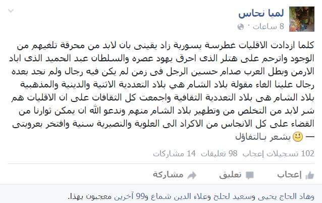RojavaNews : نشرت المحامية السورية لميا نحاس على صفحتها في موقع التواصل الاجتماعي "الفيسبوك" منشوراً دعت فيه إلى عمليات إبادة جماعية وتطهيربحق الأقليات في سورية، وجاء في المنشور: "كلما ازدادت الأقليات غطرسة بسورية زاد يقيني بأن لا بد من محرقة، تلغيهم من الوجود، وأترحم على هتلر الذي أحرق يهود عصره، والسلطان عبد الحميد الذي أباد الأرمن، وبطل العرب صدام حسين، الرجل في زمن لم يكن فيه رجال، ولم نجد بعده رجال".