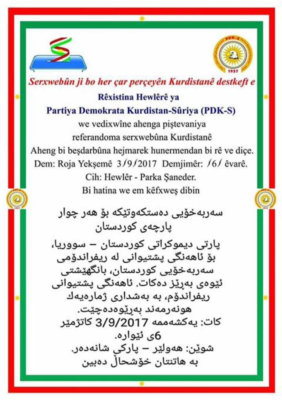 Ji berî du rojan ve ,Vexwendinek belav kir, jibo ahnga piştevaniya rêfrandoma serxwebûna Kurdistanê, ahing li gor Rêxistina Hewlêrê ya PDK-Sê wê di roja yekşemê 3yê meha 9an 2017 ,demjimêr 6ê êvarî ,Li parka şaneder ya Hewlêra peytext were li darxistin .