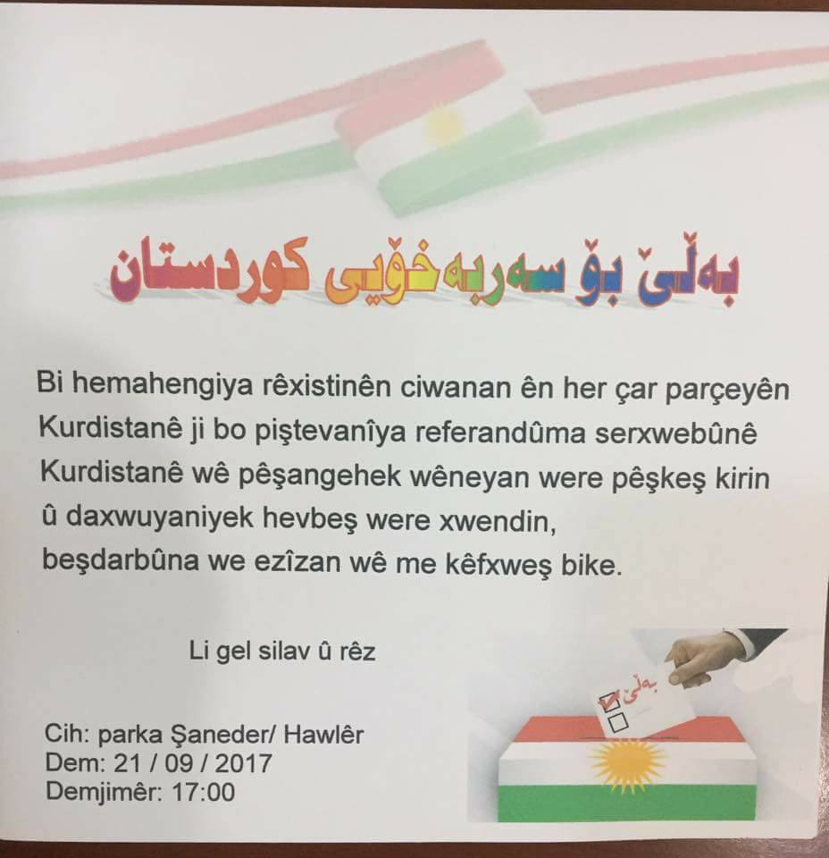 RojavaNews : Rêxistinên ciwanên Kurdistanî ji her çar parçeyên Kurdistanê , jibo piştevaniya rêfrandoma serxwebûna herêma Kurdistanê iro Çarşemê 20ê Eylûna 2017an vexwendinek belavkirin ,û têde ragihandin ku ewê pêşengeheke wêneyan ,Demjimêr 5ê êvarî li parka Şanederê li Hewlêra Peytext pêşkêş bikin,û wê daxuyaniyek hevbeş were xwendin.