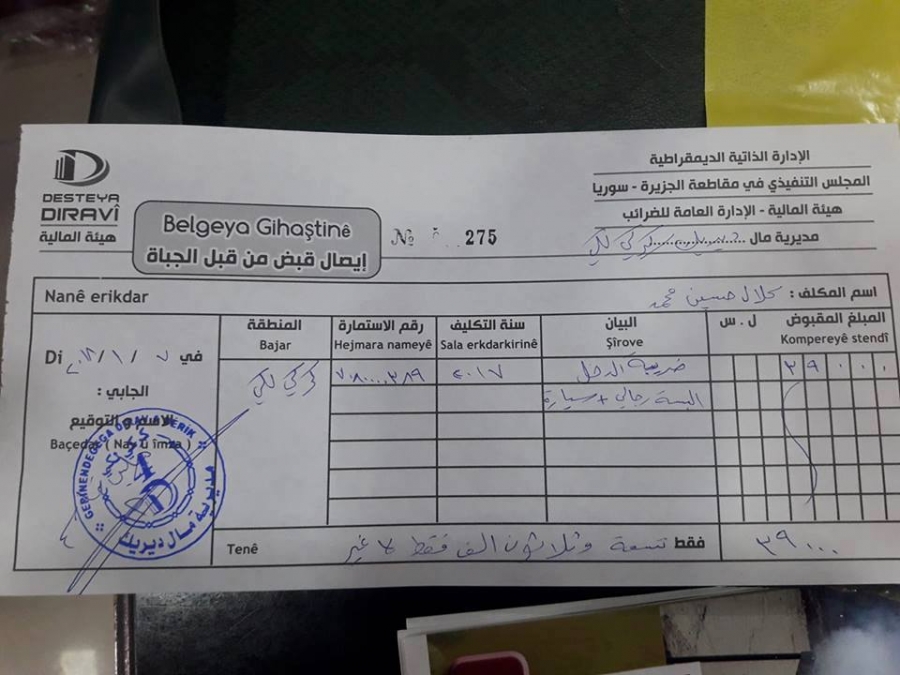 RojavaNews: Duh Yekşemê 7 . 1. 2018, Desteya Darayî ya ser bi PYDê ve, li bajarokê Girkê Legê ya Kurdistana Sûriyê belavok li ser welatiyan belav kirin, û tê de hatibû, ku divê welatî bacan wek bacên dahatê ji sala 2017an de bidin.