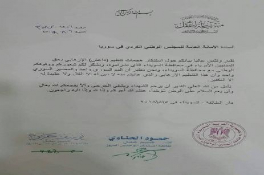 RojavaNews: Encûmena Rîsipiyên Dirziyan li Siwêda daxuyaniyeke sipasiyê ji bo Emîndariya Giştî ya Encûmena Niştîmanî ya Kurd li Sûriyê belav kir .