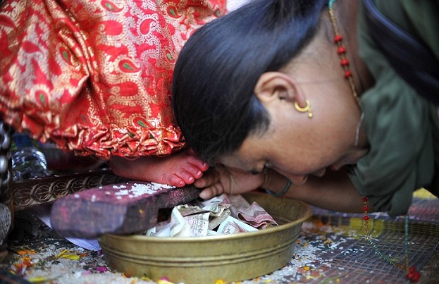 Serokwezîrê Nepalê Pushpa Kamal Dahal jî di cejna baranê ya Hînduyan de li gel hemû xelkê li ber keçika 7 salî ya bi navê xwedewenda Yunika xwe di tewênî û silav dikî.