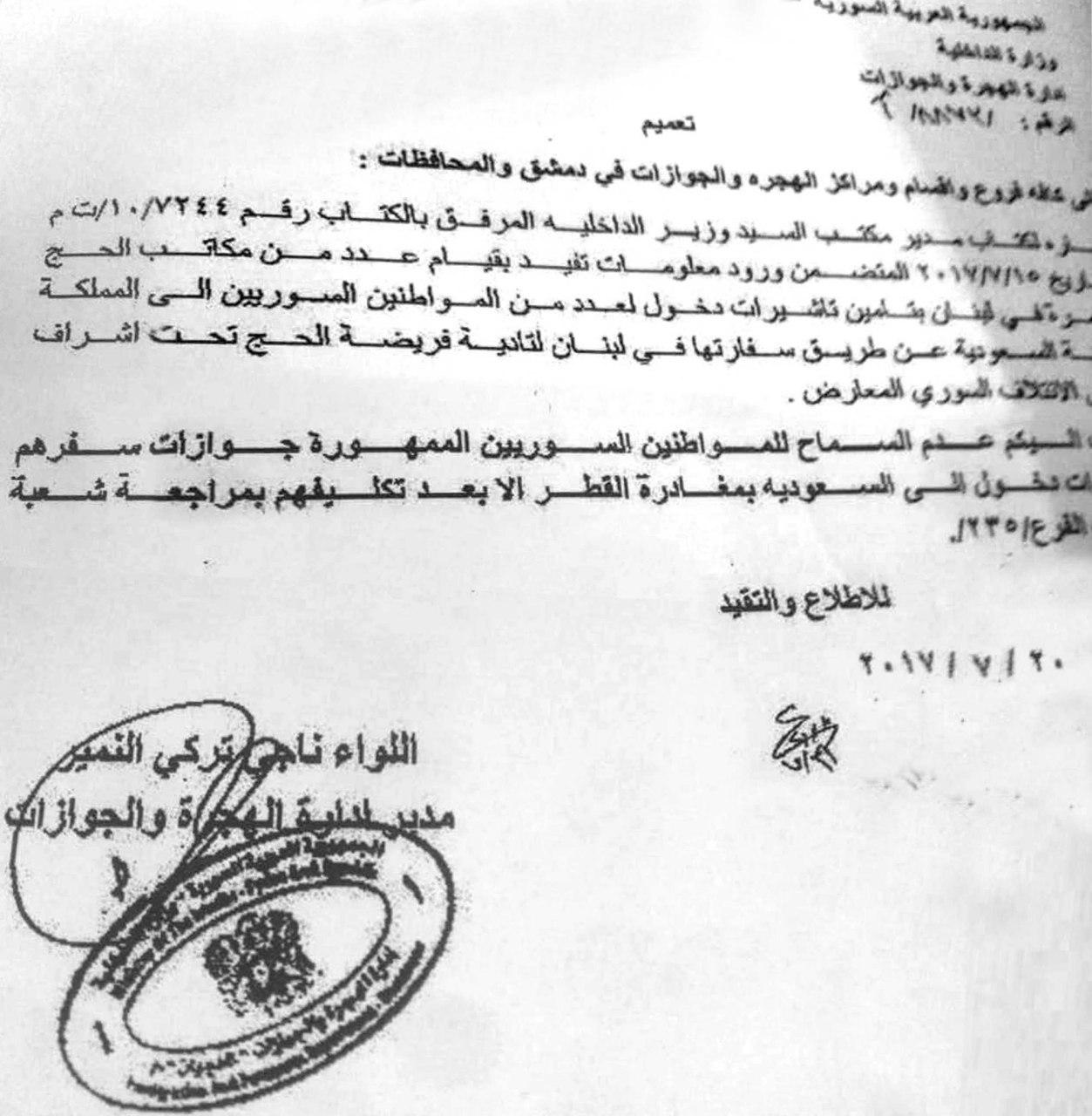 Dezgehên medyayî yên Rejîmê wêneyeke ji belgeya biryarê belav kir ku ew li 2/7/2017 deketiye û emzeya rêveberê Rêbeberiyê Nacî Tirkî El-Numêr li ser heye û merceke di biryarê de heye çi kesê dixwaze biçe li şaxê 235 vegere.